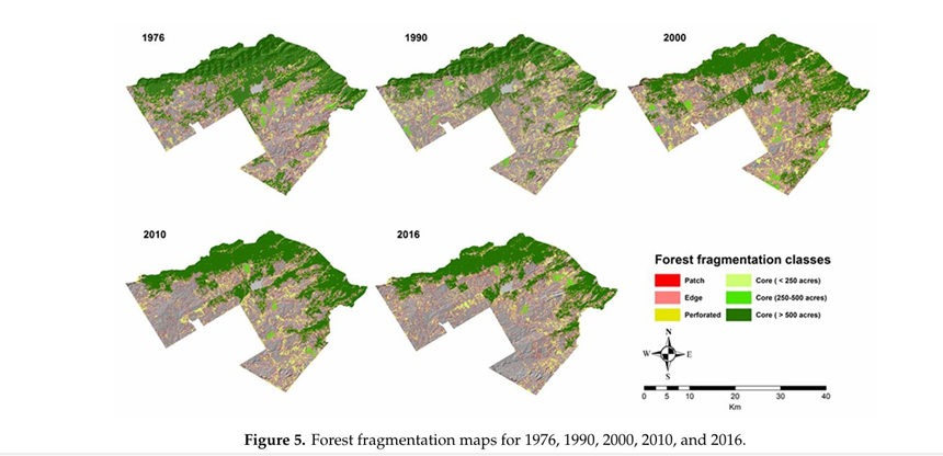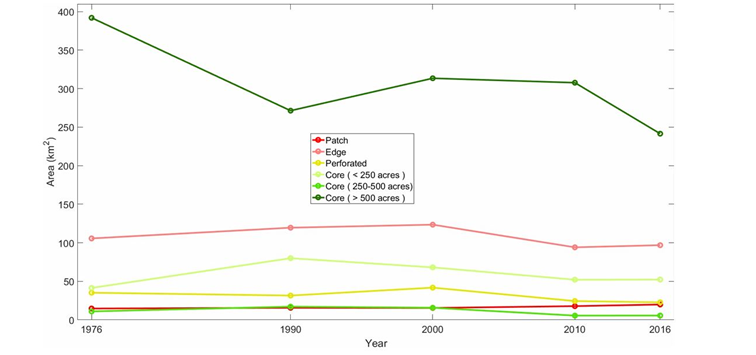 جنگلاتی رقبہ مسلسل کم اور تقسیم شدہ ہوتا گیا۔ بڑے جنگلاتی بلاکس ٹوٹ کر چھوٹے حصوں میں تبدیل ہو گئے۔