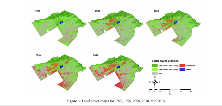 سال1976 سے 2016 پر محیط سائنسی تحقیق ظاہر کرتی ہے کہ شہری آبادیاں 3.31 فیصد سے بڑھ کر 18.80 فیصد ہو گئیں۔ جبکہ بڑے جنگلات مسلسل کم اور تقسیم ہوتے گئے۔