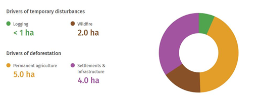 سن2001 سے 2024 کے دوران 14 ہیکٹرپر درختوں کا غلاف ختم ہوا جس کے نتیجے میں 77 فیصد نقصان مستقل جنگلاتی کٹاؤ کی وجہ سے ہوا جو کہ 2000 کے درختوں کے غلاف کے رقبے کا 0.45 فیصد بنتا ہے، اور اس سے 5.5 سی او ٹو ای کے برابر اخراج ہوا۔