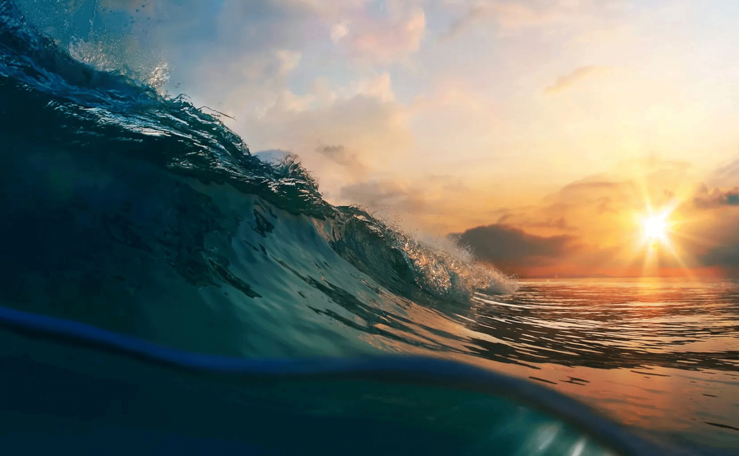 A dramatic close-up view of a powerful ocean wave captured at sunset. The golden sun reflects across the water’s surface as the wave rises, symbolizing the growing impact of global warming and rising ocean temperatures highlighted in recent climate reports. The image represents the accelerating heat absorption by oceans and its implications for sea level rise, marine ecosystems, and extreme weather patterns.
